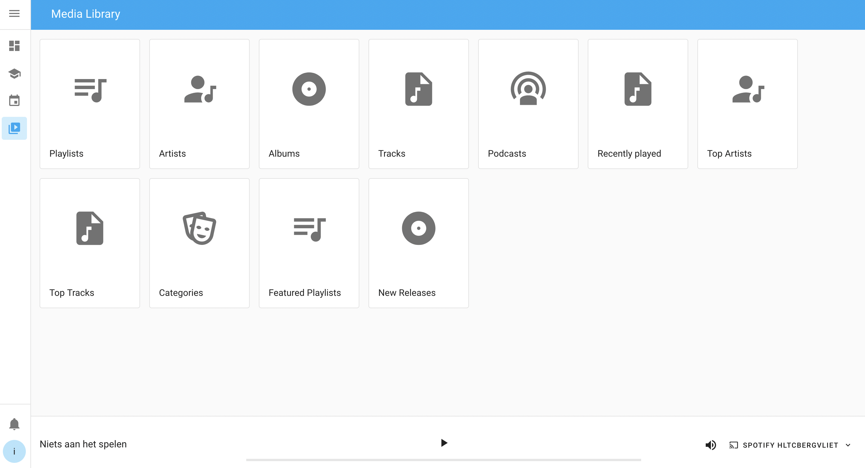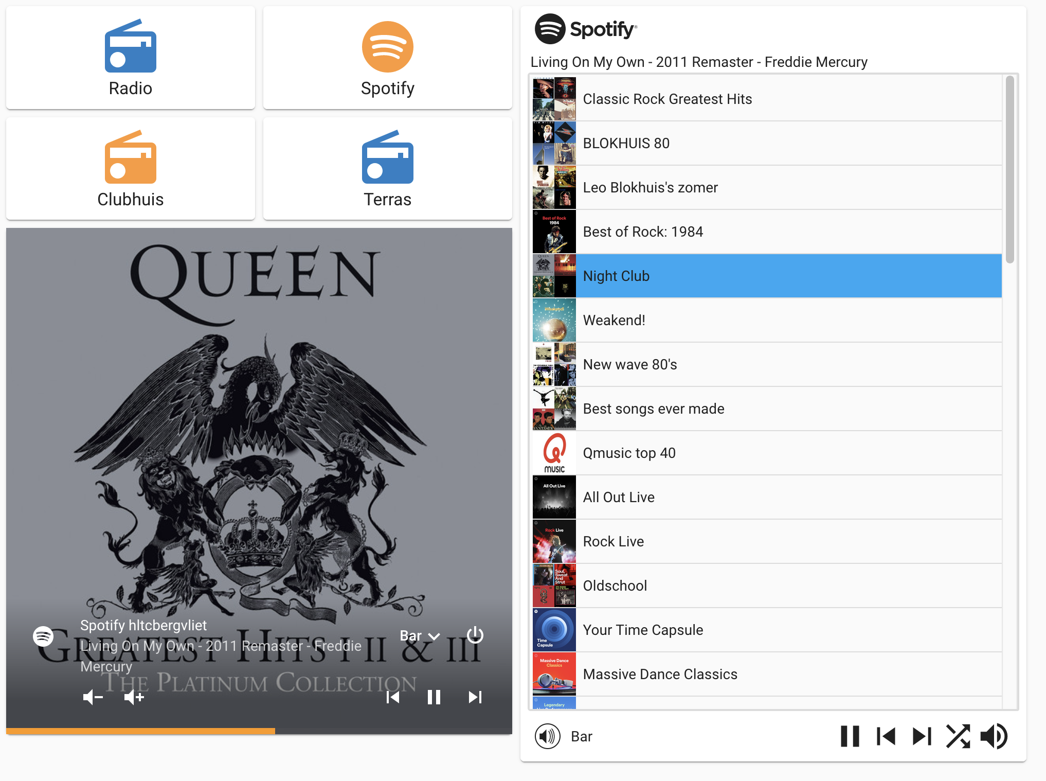 Dit overzicht geeft je de mogelijkheid om op verschillende radiostations af te stemmen danwel een Spotify playlist te selecteren.