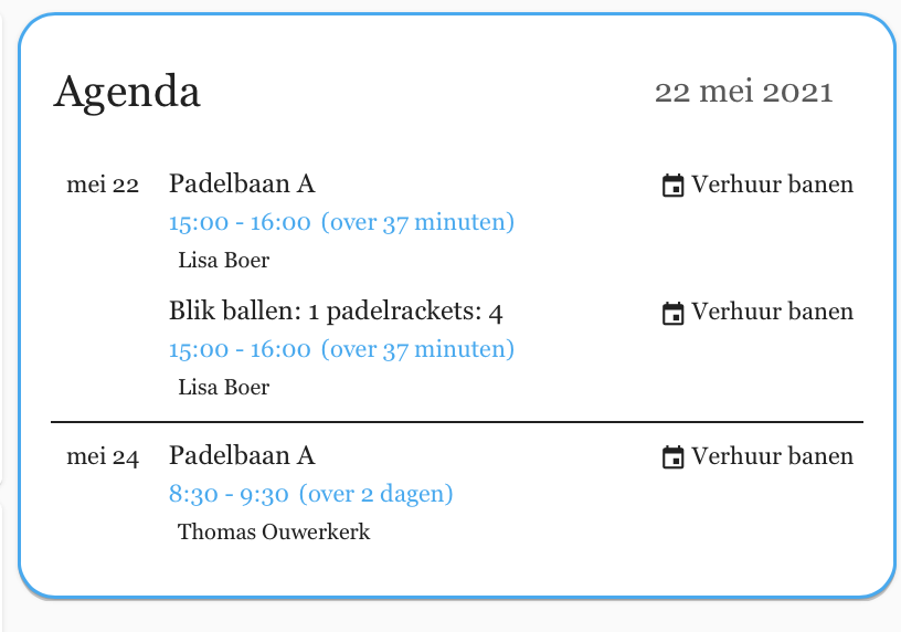 Op de iPad is een kalender met daarop de uren dat de Padelbaan is verhuurd en eventueel de gereserveerde rackets en/of koop van blik ballen. Deze materialen zijn betaald dus na controle op de naam kun je de rackets uitgeven en na afloop van de huurtijd weer innemen.