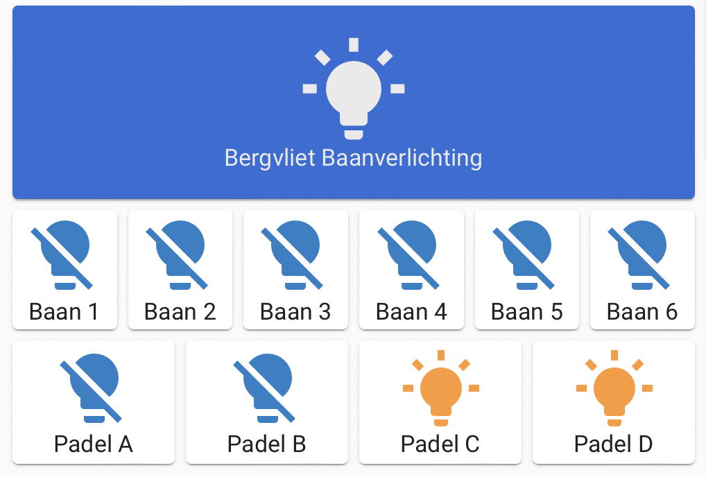 Op dit tabblad zie je de schakelaars voor de Tennis en Padelbanen. Deze worden pas zichtbaar ruim voor de schemering start.