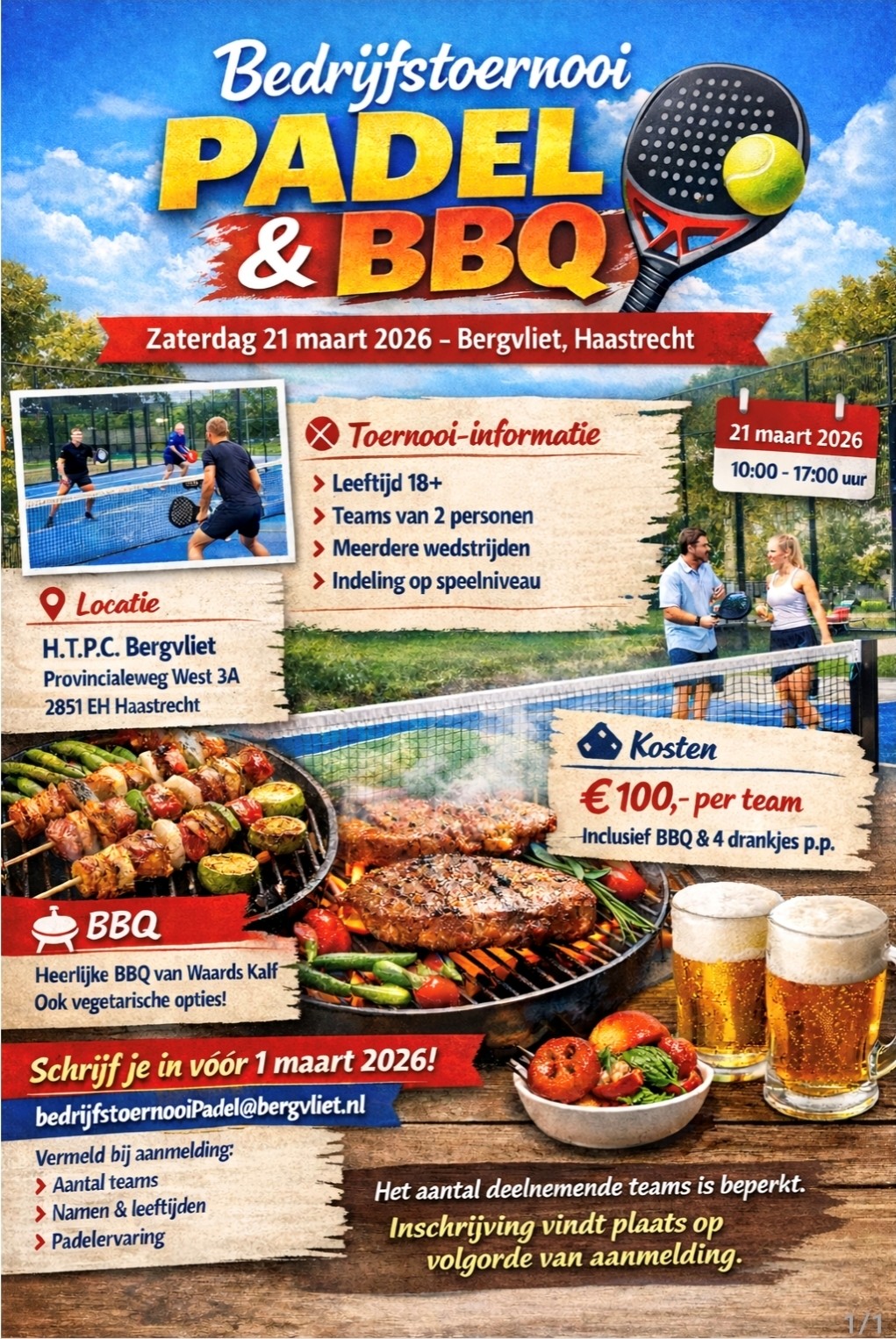 Zin in een gezellige en sportieve dag met collega's? Doe dan mee aan het bedrijfstoernooi padel op zaterdag 21 maart!