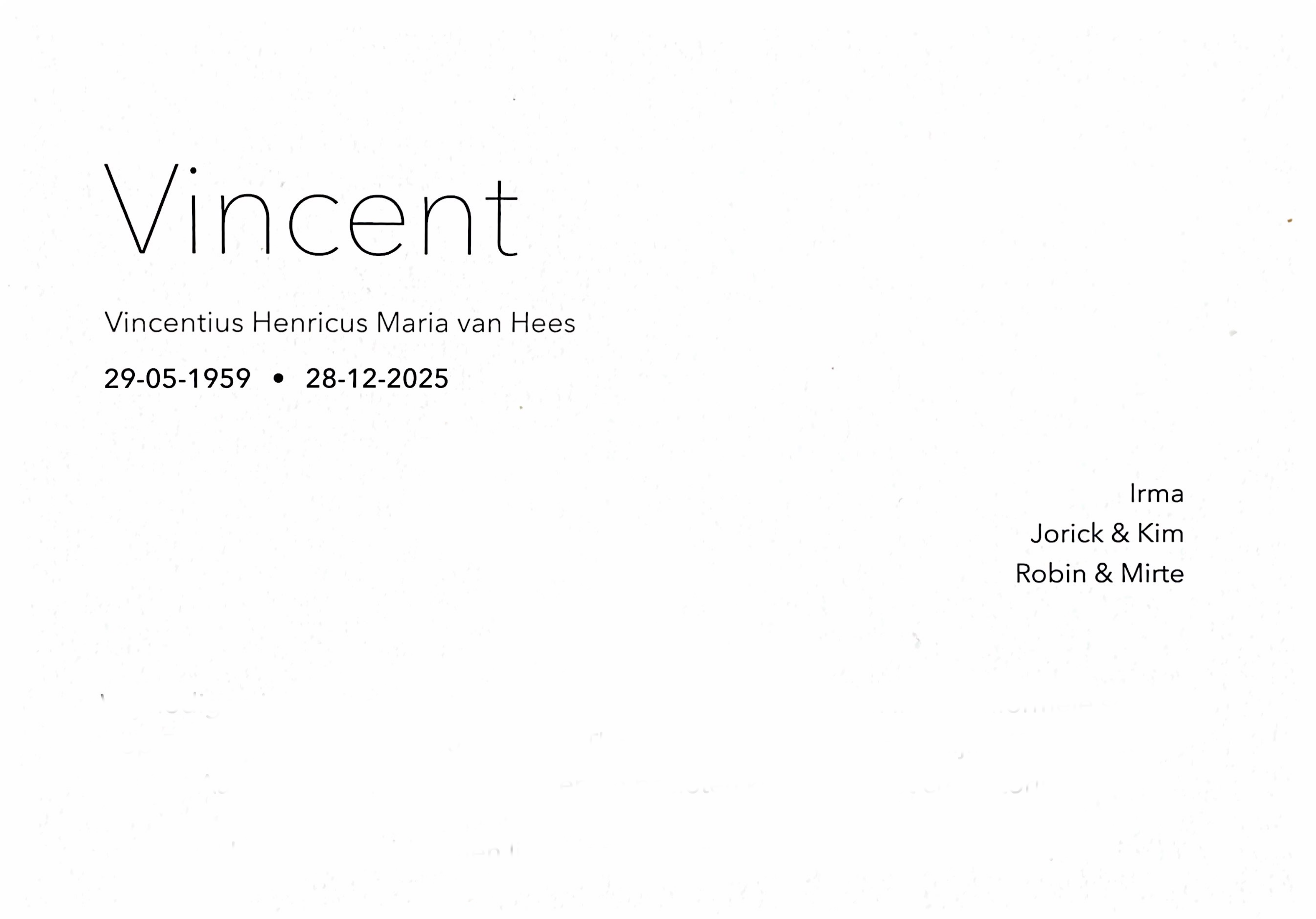 Met grote droefenis hebben wij kennisgenomen van het overlijden van Vincent van Hees. De crematie zal maandag a.s. in besloten kring plaatsvinden.