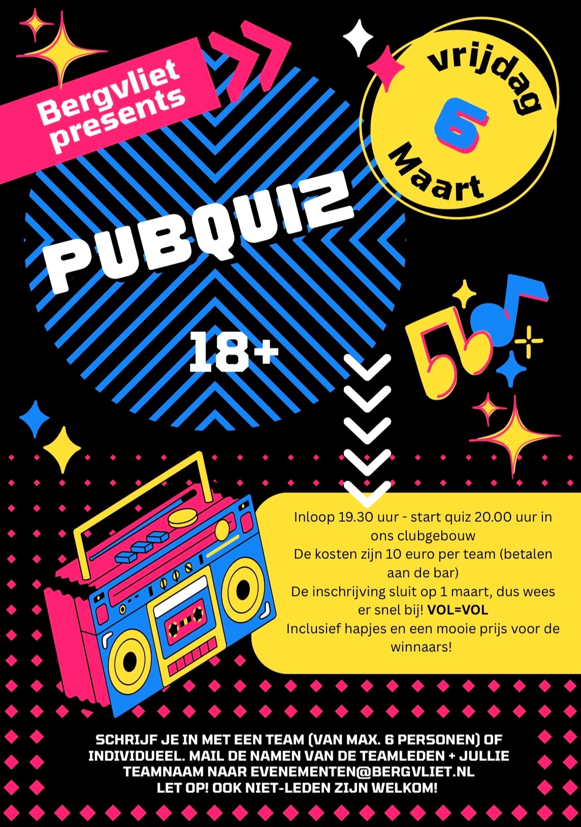 Vrijdag 6 maart wordt er weer een Pubquiz georganiseerd door de evenementencommissie. Kom je ook?