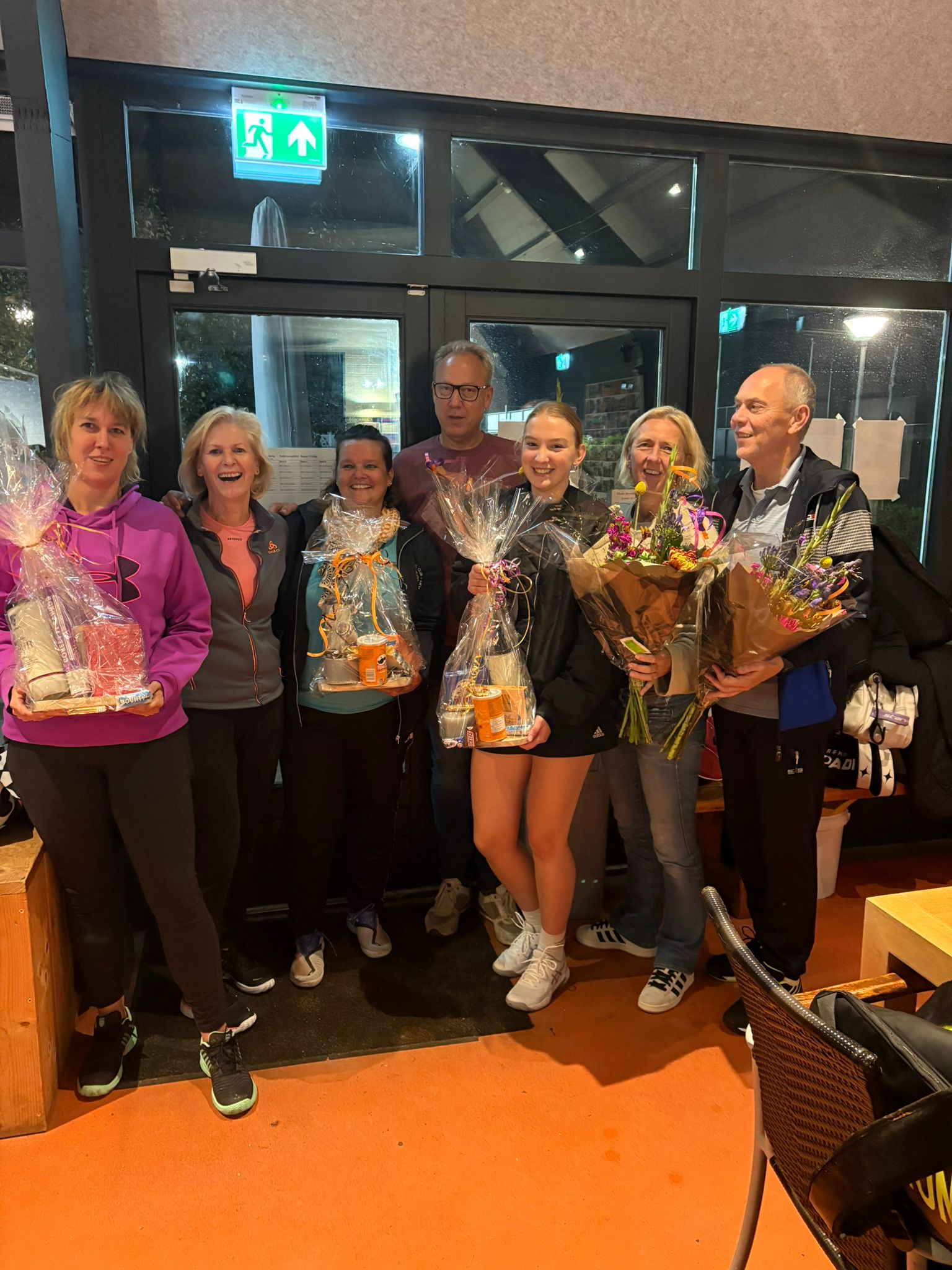 En natuurlijk kan een bedankje aan de organisatie niet ontbreken! Bedankt André, Corine, Gert en Esther voor jullie inzet en enthousiasme. Jullie kregen terecht een mooie bos bloemen als dank voor het vlekkeloos verlopen toernooi.