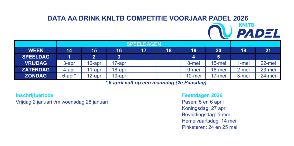 De competitie wordt aangeboden op vrijdagavond (leeftijd 15+), zaterdag en zondag. Een Padel competitieteam bestaat uit minimaal 4 spelers, waarbij alle combinaties mogelijk zijn in de gemengde competitie.