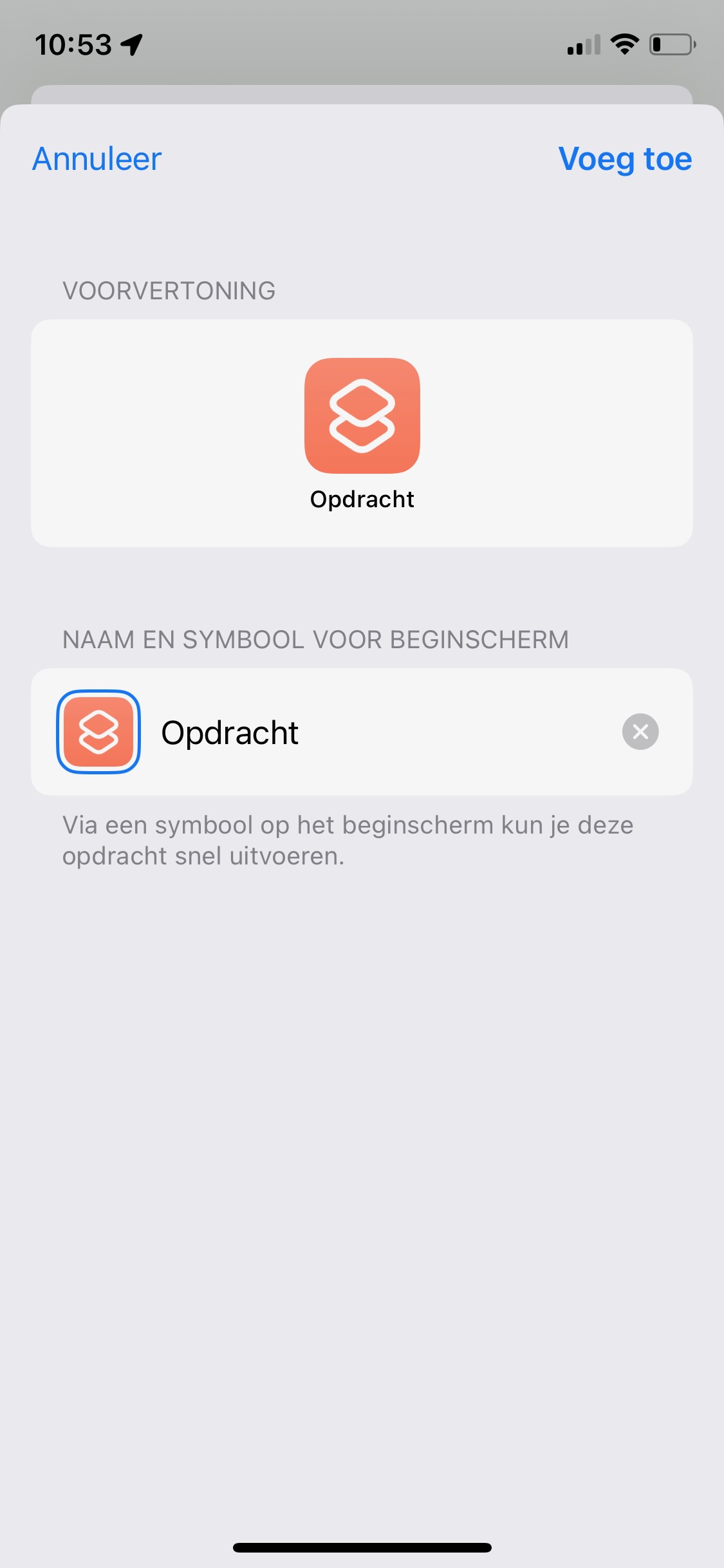 Je kunt dezelfde optie als hierboven gebruiken echter open dan de url in Safari. In plaats van de drie puntjes klik je op het vierkantje met het pijltje naar boven, vervolgens selecteer je 'zet op beginscherm'. Je kunt de naam van de snelkoppeling aanpassen en kies vervolgens 'Toevoegen'.