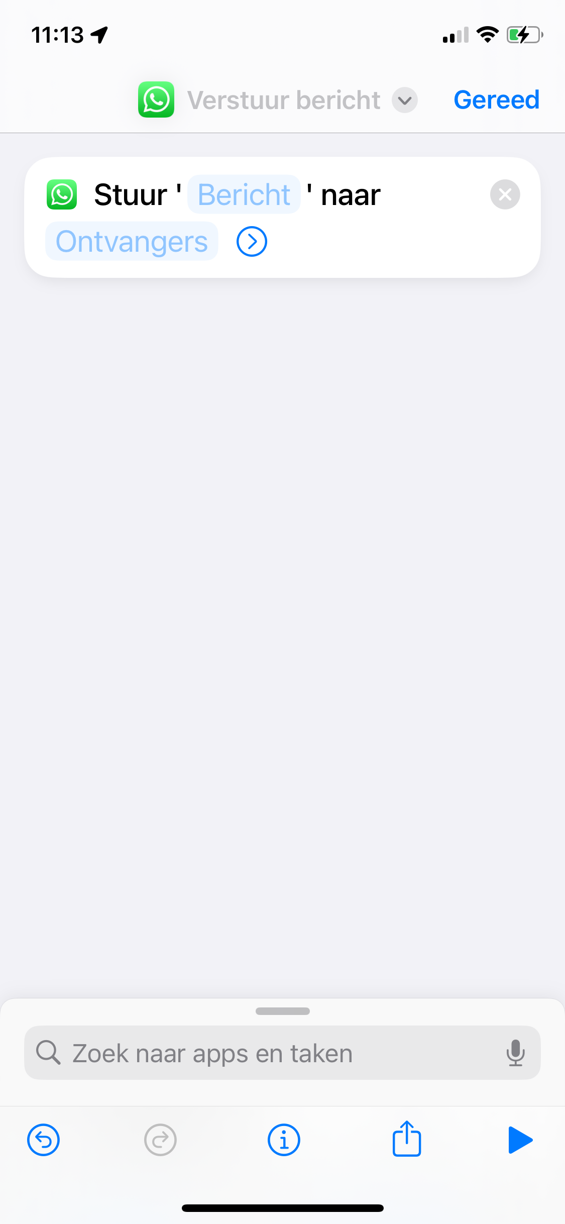 - Tik onderin het scherm op ‘Zoek naar apps en taken’. In het Zoekscherm tik je Whatsapp. In de lijst die je vervolgens te zien krijgt kies je 'Verstuur bericht' door op het +’je erachter te tikken.